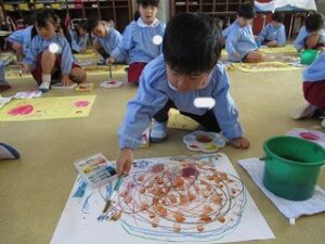 色を混ぜ合わせながら「もうちょっと赤色たそうかな~」と、葉っぱの色を考え中!