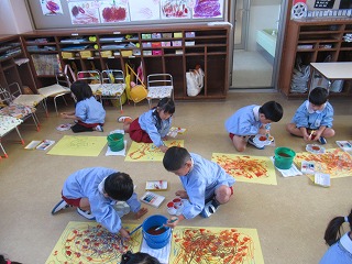 色を混ぜ合わせながら「もうちょっと赤色たそうかな~」と、葉っぱの色を考え中!