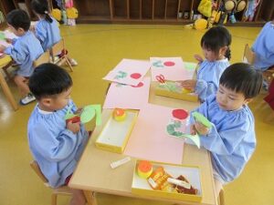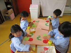 今日は、あおむしさんが食べる梨をはさみを使って作ったよ✂