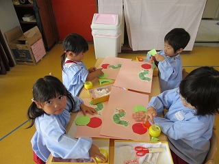 梨の形に切れたら、あおむしさんに「はい!どうぞ!」と糊で貼りつけました☆