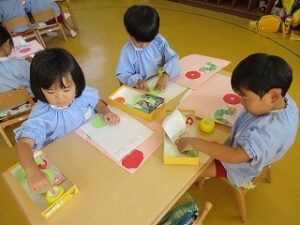 丸の形に線が描かれている画用紙を、線に沿ってはさみで切りました(*^-^*)