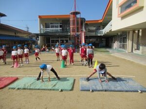 1の合図で手をつき、2の合図で開脚飛び、3の合図で前にならえを守って取り組みましたよ♡