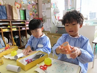 まずは、顔の折り紙をトイレットペーパーの芯に巻いていきます。