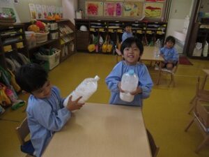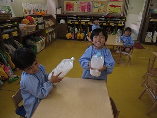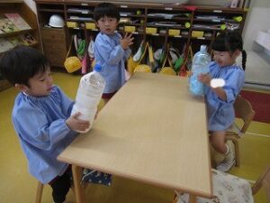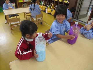 ペットボトルに水と絵の具を入れて、色混ぜ~フリフリしたら完成!