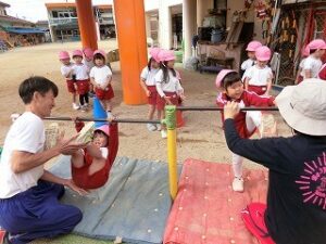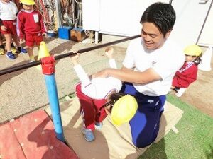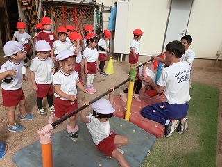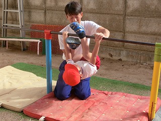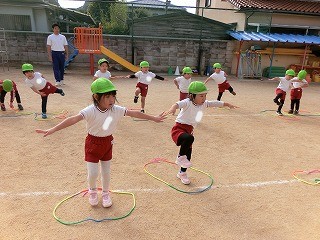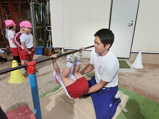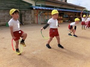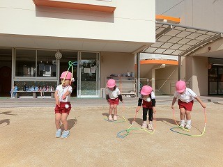 「パンツ履いて!シャツ脱いで!」の掛け声に合わせて、縄跳びの1回とびにチャレンジしました。
