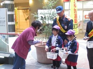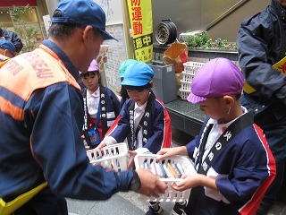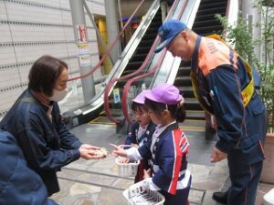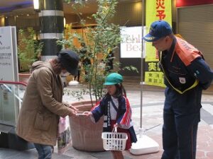 東消防署の方と一緒に、歩いている人に自分たちで声をかけながら、ティッシュを配りました。