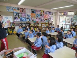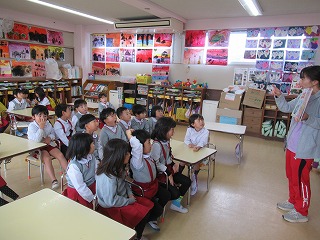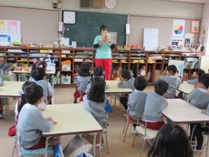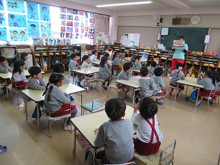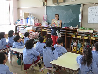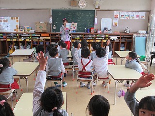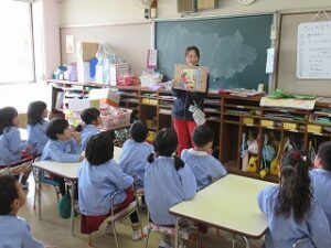 幼稚園に残った園児は園内で火災予防の紙芝居「かちかち かじようじん」を読んで火事の時はどうしたらよいか、火事がおきないようにお家の人とできることなどを学びました。