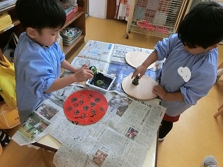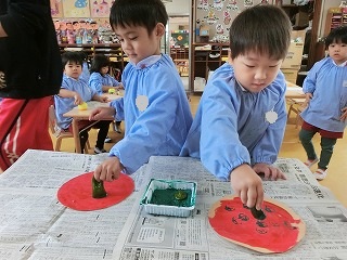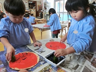 ピーマンを野菜のスタンプで、ポンポンとスタンピング!