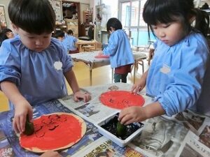 緑の絵の具でピーマン、紺色の絵の具をオリーブに見立てて作りました。