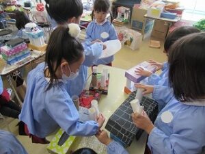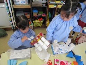 「忍者のお城にしたい!」「私のお城はアナ雪!」「アラジンのお城にしようかな~」と、自分のお気に入りのお城を組み立てていきました。