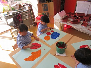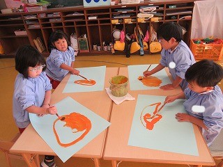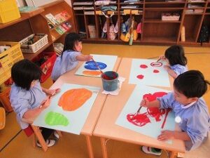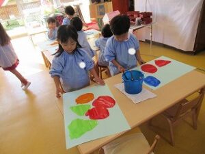 はらぺこあおむしさんが好きなフルーツを大きな画用紙へ、絵の具を使ってたくさん描いたよ~😊