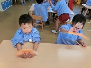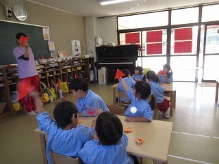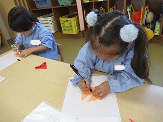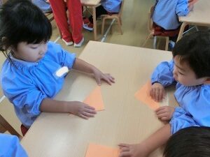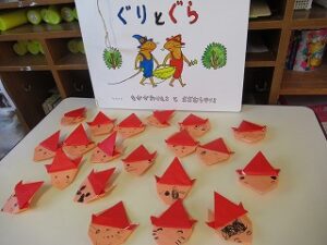 ぐらの帽子は、赤い折り紙を半分に折って出来上がり!