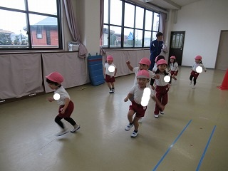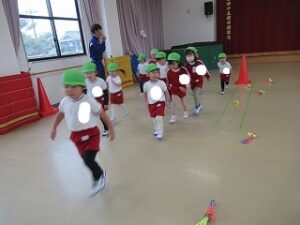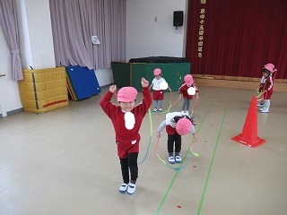 「パンツ履いて、シャツ脱いで!」の掛け声とともに、縄跳びを歩いて超えます。