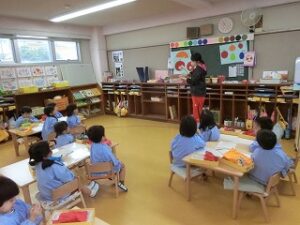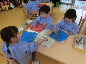 電車やハートの形にぬったり、お友だちと楽しく製作中のもも組さん♡