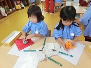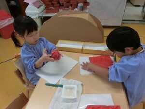 新聞紙をボールのように丸め、画用紙に水のりを塗って丸めた新聞紙の上から、ぎゅっぎゅっぎゅっ!と貼り付けます。