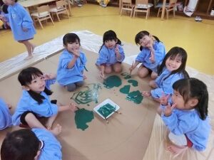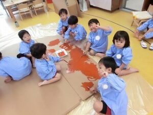 大きな段ボールへ絵の具で色付けもしたよ♪