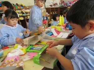 ティッシュペーパーの箱を切り抜いて、中に品物を作っていきますよ☆