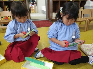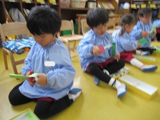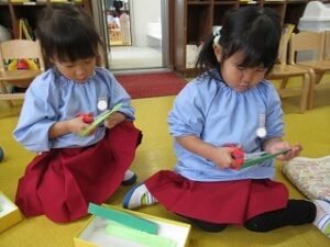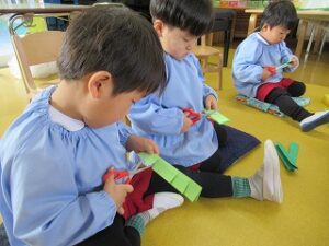 まずは、画用紙にハサミで切り込みをいれ、葉っぱ作り✂