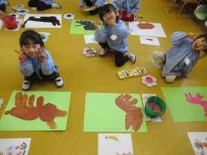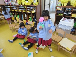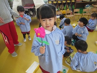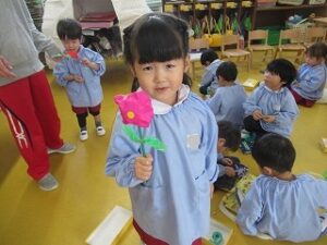 ストローを茎にして、給食で食べたゼリーカップに折り紙を貼って、葉っぱをつけてお花が完成しましたよ。