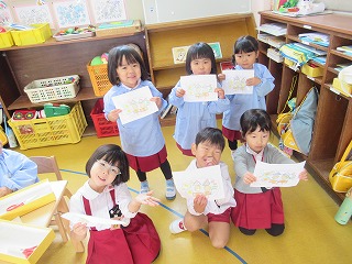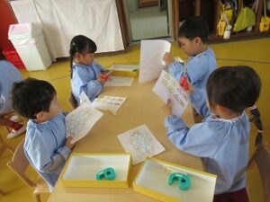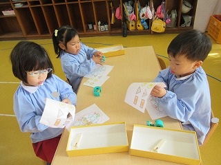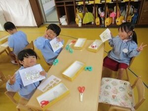 切り終わった具材は、おなべが描いてある紙にセロハンテープで貼っていきます🍢