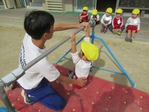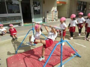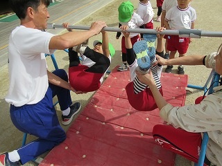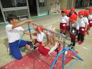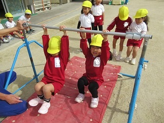 落ちないように棒をしっかり握り、両足を鉄棒に足を掛けて「コウモリポーズ!」