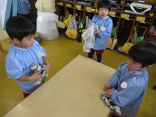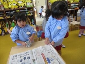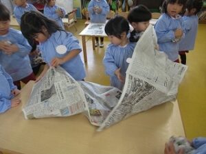 出来上がった新聞紙は、めろん組に大きく飾られている“ピザ窯”の一部になります!