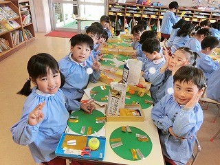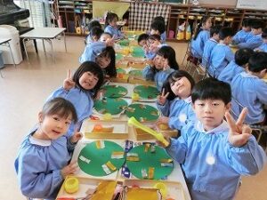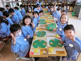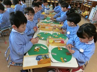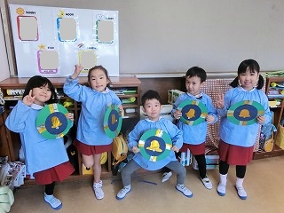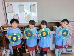 キラキラ折り紙で模様をつけて、真ん中にベルを貼りました。