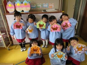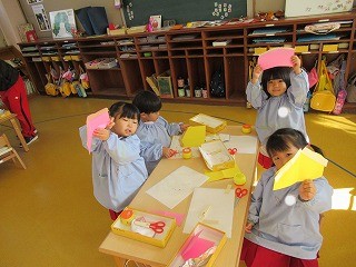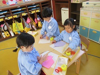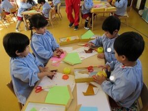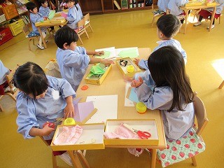 絵馬の形に画用紙をはさみで切っていくよ✂