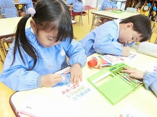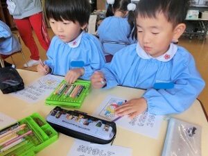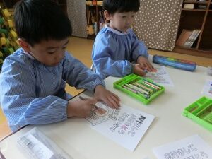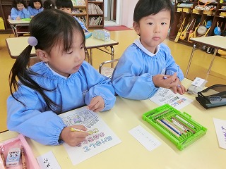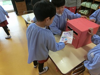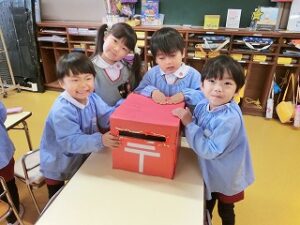 宛名にお友だちの名前を書いて、あじさい組、すみれ組のポストにいれたよ📮