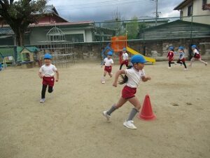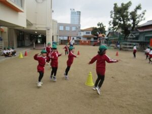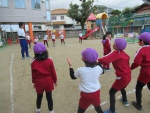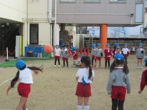 中当てゲームでは、ボールを持ったらすぐに投げる!!ということに挑戦。