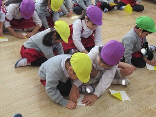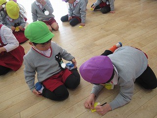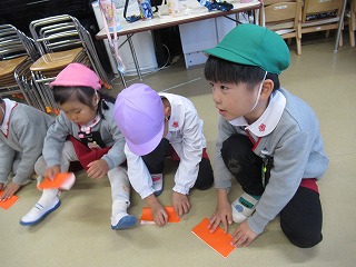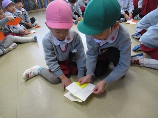折り紙で「ベル」も作りました。難しいところは、お兄さん、お姉さんの年長さんが教えてくれたり、作ってくれたり…やさしくかかわる姿が微笑ましいです💕