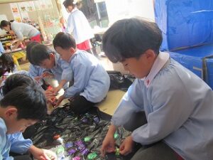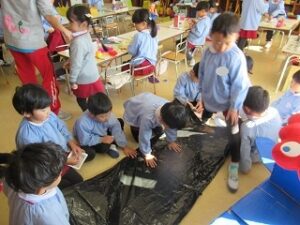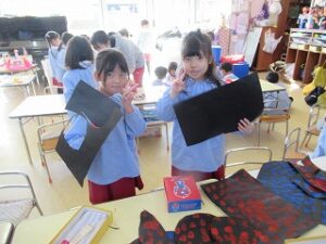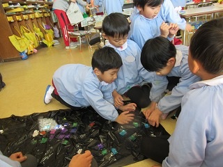 黒いカラーポリ袋にホイル紙を貼り付けて花火を表現。