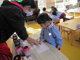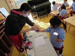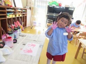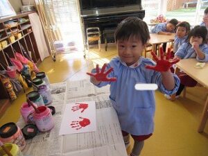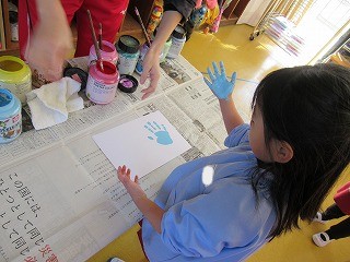 絵の具を手に塗ると…少しこちょばくて…でも楽しみ!どんなのができるかな。