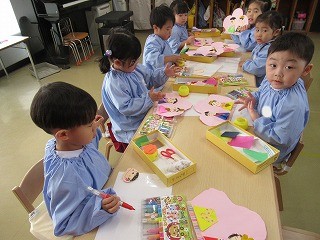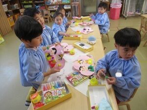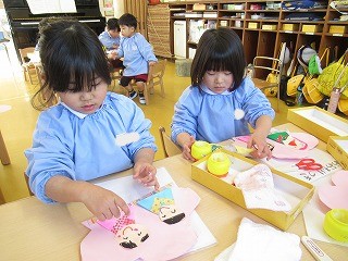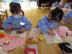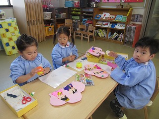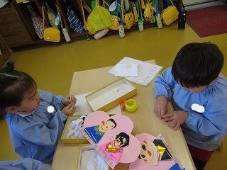 先日作成した、お内裏様とお雛様をもものお花へ貼りました♪