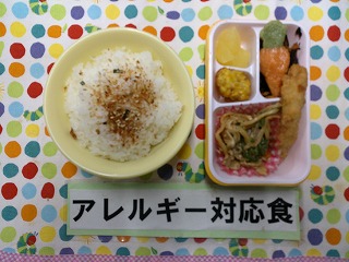 ご飯(かつおみりん)、チンジャオロース風、スティックチキン、ひじきの炒め煮、とうもろこしのつまみ揚げ、野菜かまぼこ(人参)、りんご缶