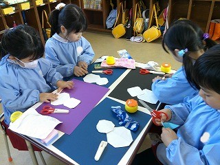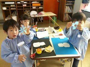 折り紙を使って、雪だるまや雪の結晶を作ったよ⛄