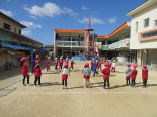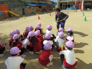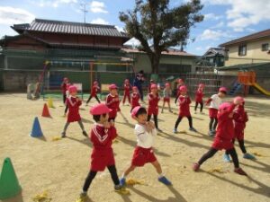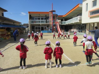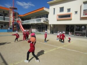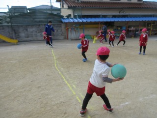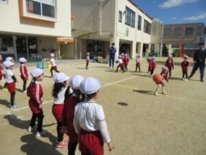 今日の体育指導はなわとびと、ボール投げの練習から中当てゲームをしました。