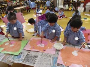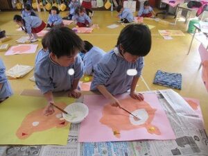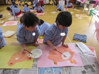 昨日から作成中の劇の発表で演じた、三匹のこぶたやオオカミの絵画!