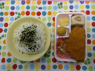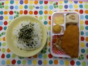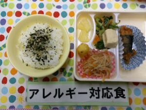 ご飯(海苔香味) 、チャプチェ(副菜)、こうや豆腐の煮物、チンゲン菜の中華和え、ミニハッシュドポテト、パイン缶