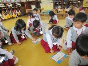 先生が言う、アルファベットと同じものがカードにあれば、赤い印を置いていきます。