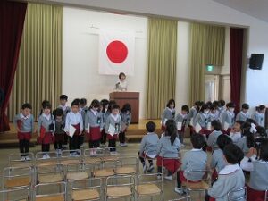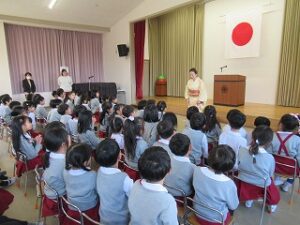 今まで、お辞儀のしかた、箸の使い方、茶の湯で抹茶を頂いたり、年長組になって初めてのことをたくさん教えて頂きました。