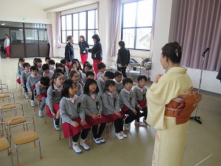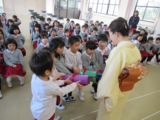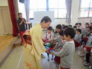 今まで、お辞儀のしかた、箸の使い方、茶の湯で抹茶を頂いたり、年長組になって初めてのことをたくさん教えて頂きました。