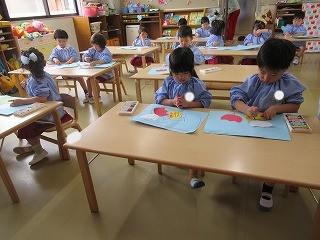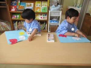 お部屋に帰ったあとは、製作の準備!スモック着て、クレパス出してます。