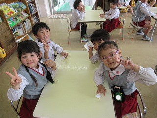 一人ずつ、先生が席を発表してくれて、椅子を動かすと、同じテーブルの友達と顔を合わせて、嬉しそうににっこり♡