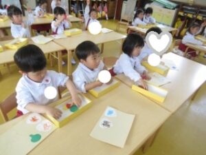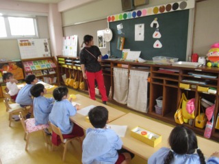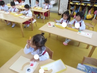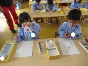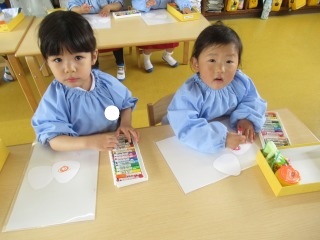 おべんとうの絵本を見てお弁当作りをしました。おにぎりに好きな具をクレパスで描きましたよ☆