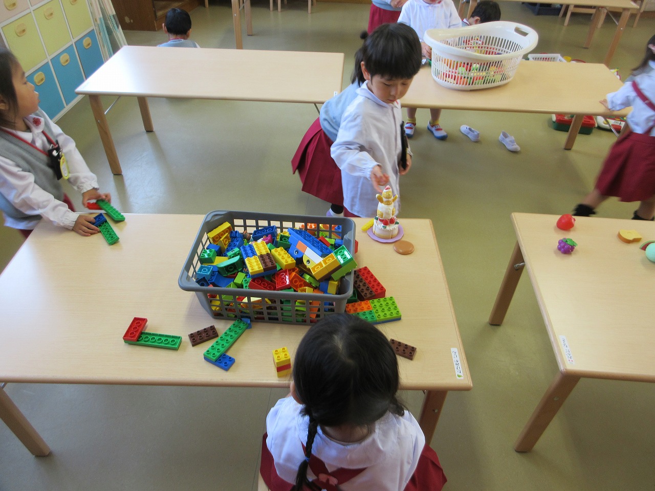 お家の人と別れるのが寂しっくって、涙の「いってらっしゃい」になったお友だちもいましたが、お部屋に入ったら、おもちゃや絵本を出して、楽しい音楽が流れていて…どんどん楽しくなってきましたよ!
