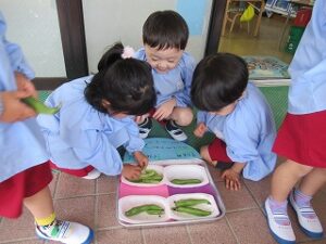 絵本「そらまめくんとおまめのなかま」を読んで、そらまめやうすいえんどうに興味津々のれもん組のお友だち。