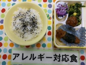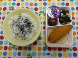 ご飯(ゴマ塩)、アジフライ、スパゲティソテー、ミートボール(照焼)、ほうれん草とコーンのソテー、ミニゼリー(ぶどう)