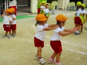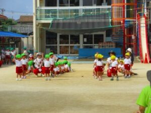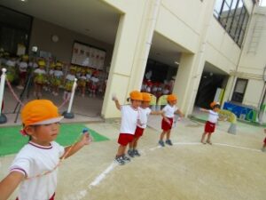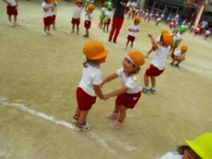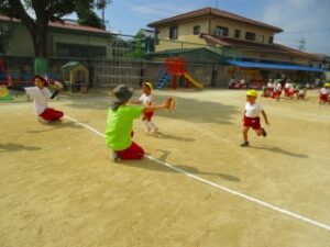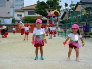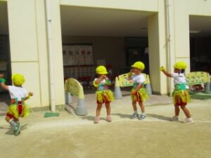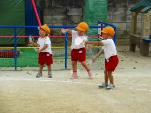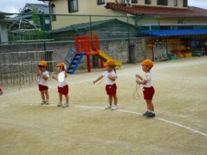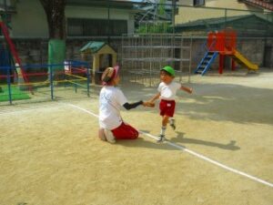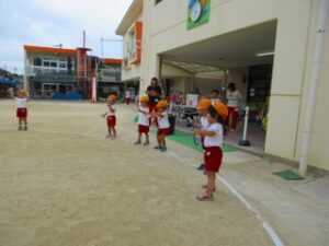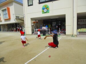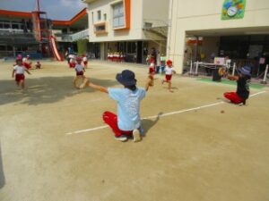 小さな園庭を上手に使って本番と同じ距離で行います。登美丘西小学校とは少し違いますが、きっと大丈夫!頑張れ!