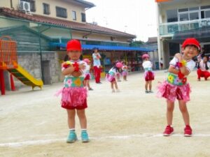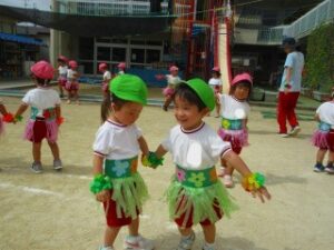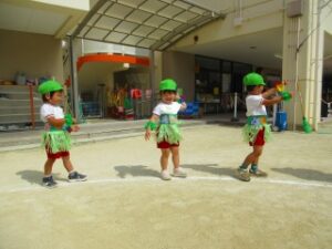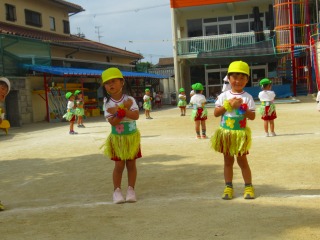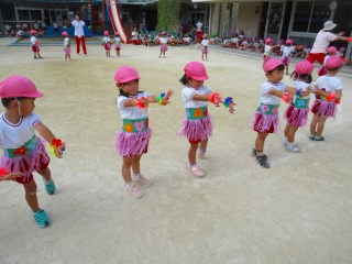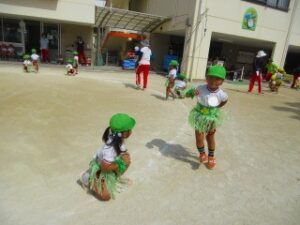 両手首に花🌸手作りの腰みのをつけて♪アロハ・エ・コモ・マイ♪に合わせて、かわいくダンス💕